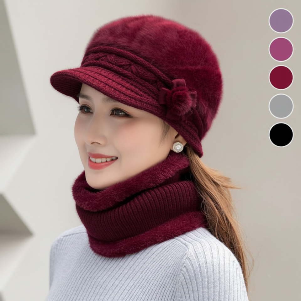 Set di berretto lavorato a maglia e scaldacollo in pelliccia di coniglio per donne di mezza età ELM-223