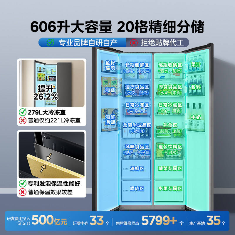 Frigorifero Side-by-side Midea a Doppia Porta, 606 Litri, Grande Capacità, No-Frost, Inverter, Ultra-sottile, Integrato, Raffreddamento ad Aria