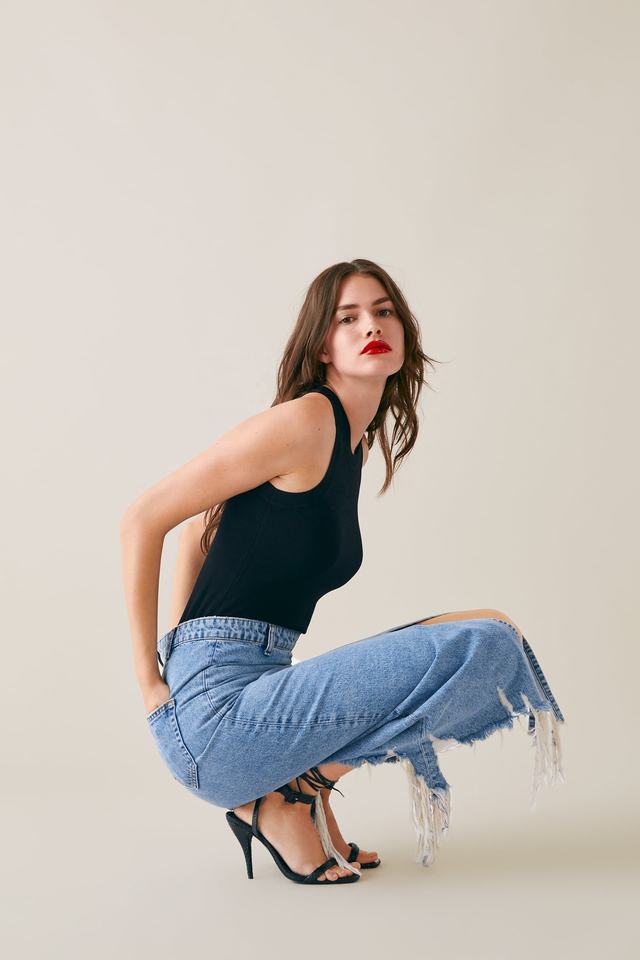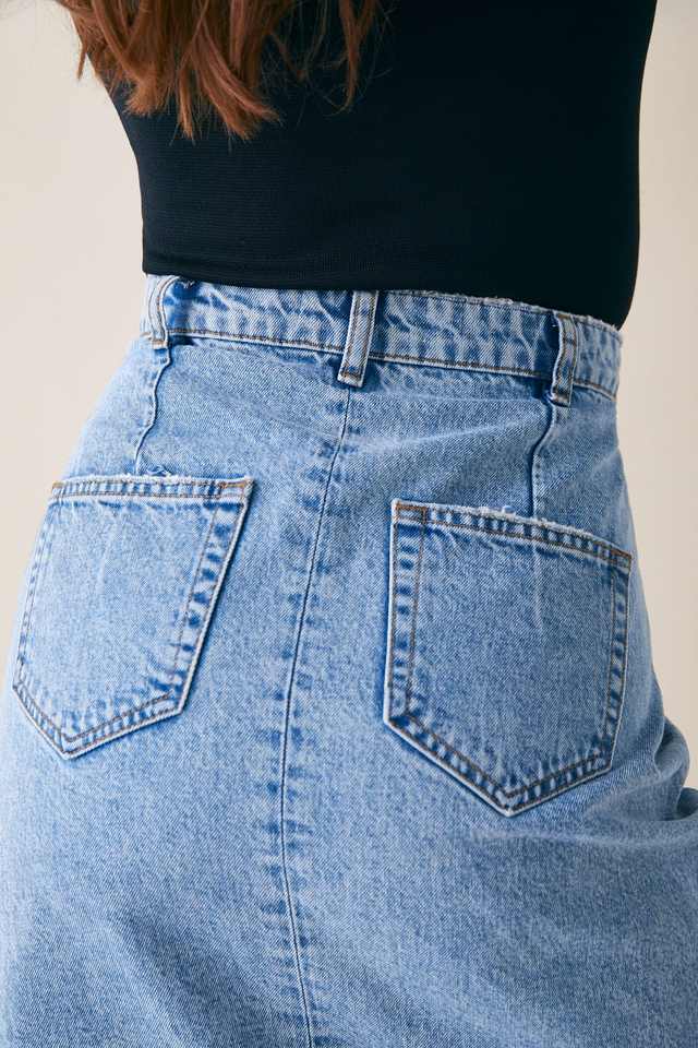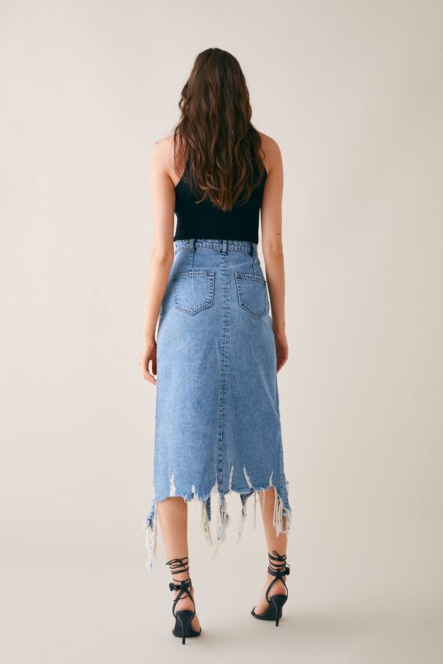 Midi denim gonna con spacco vendita calda distressed luce blu jeans delle donne gonne