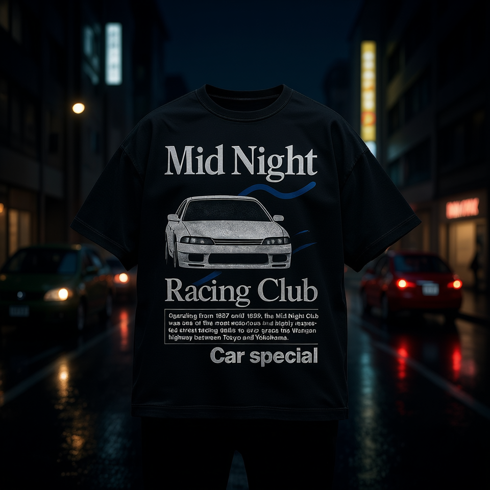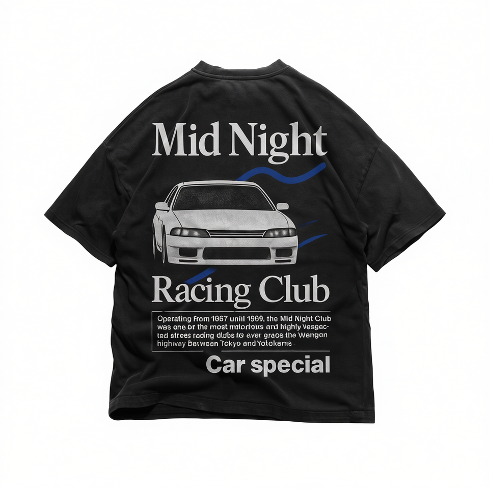 T-shirt Midnight Racing Club nera lavata, vestibilità oversize squadrata, unisex, con grafica JDM Streetwear