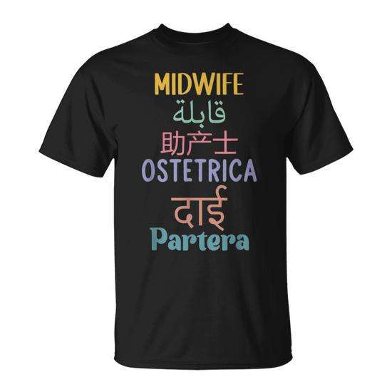 T-shirt per ostetriche con design multilingue per infermiere e studenti, girocollo unisex per adulti, stampa digitale a maniche corte