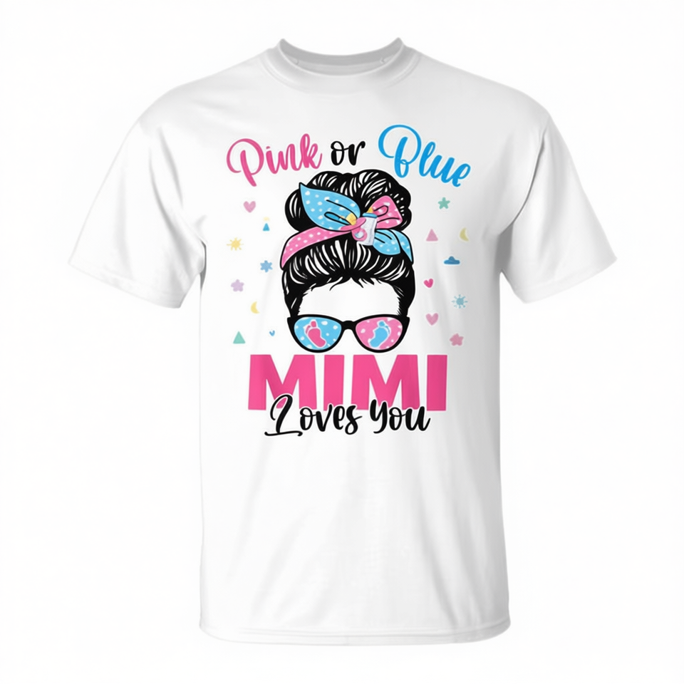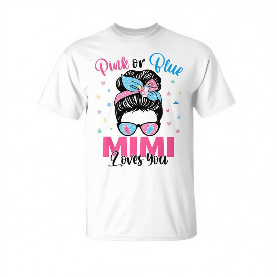 T-shirt Mimi Loves You Gender Reveal Messy Bun disponibile in rosa o blu per promozioni