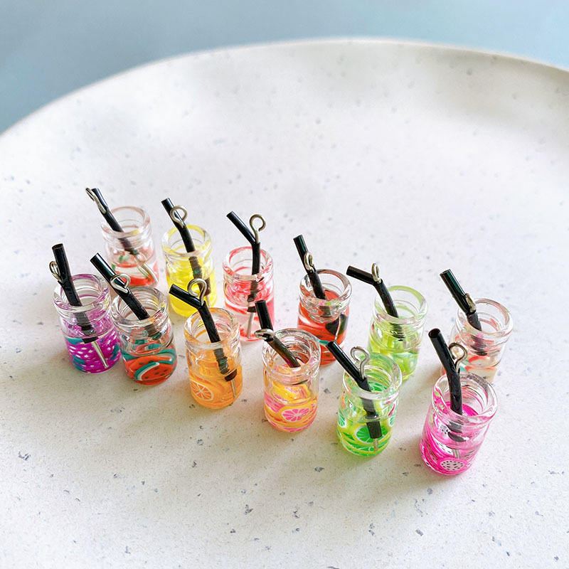 Ciondoli Mini barattolo di frutta | Vasetto di succo in miniatura in resina ciondoli per tazza di succo con fetta di frutta colorata e paglia per la creazione di gioielli