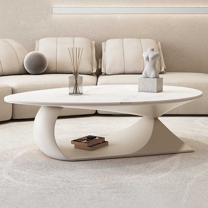Tavolino da Caffè Ovale di Design Minimale in Colore Legno per Piccolo Appartamento con Piano in Pietra Sinterizzata PSM-H005