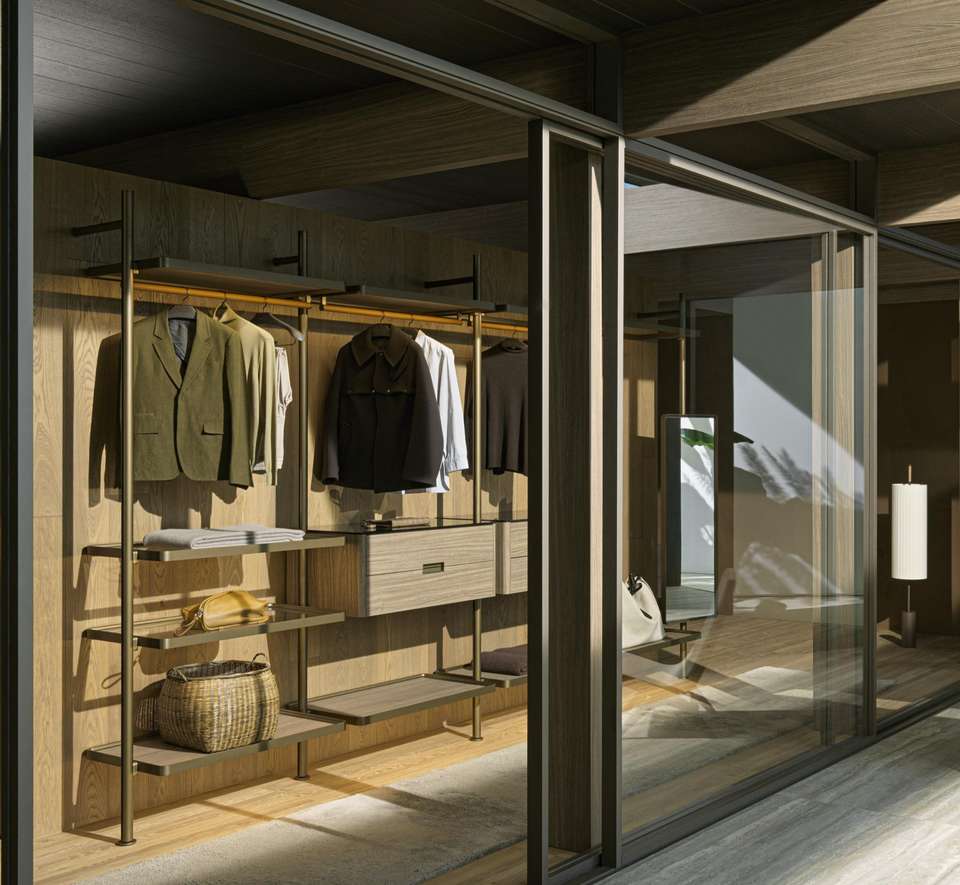 Moderna passeggiata aperta nell'armadio armadio con specchio