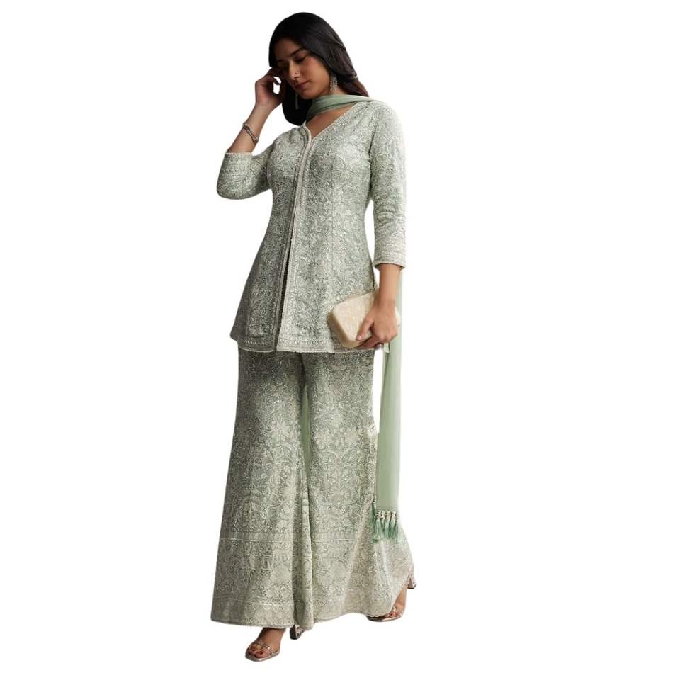 Menta blu Georgette Palazzo abito con paillettes e Resham lavoro all'ingrosso donna abbigliamento etnico OEM fabbrica fornitore di rinfuse