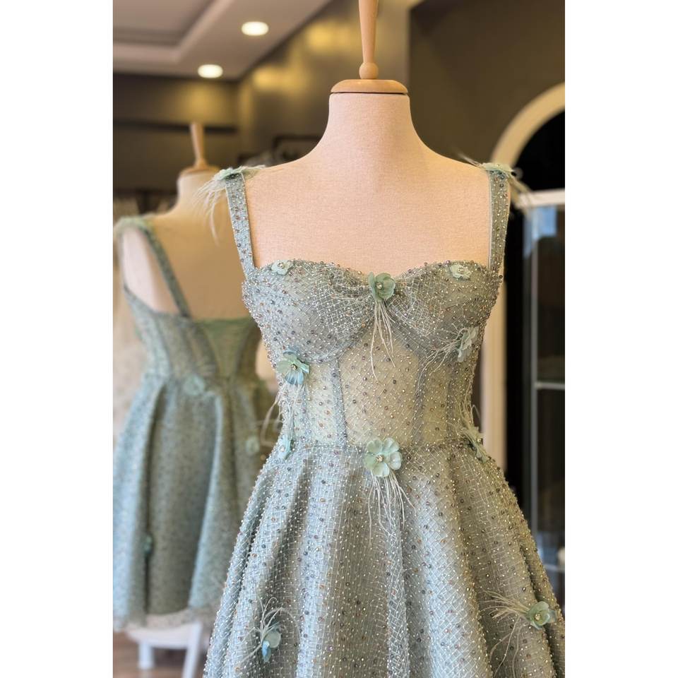 Mini abito da sera e da cocktail con sovrapposizione in pizzo verde chiaro con perline e dettaglio floreale tridimensionale