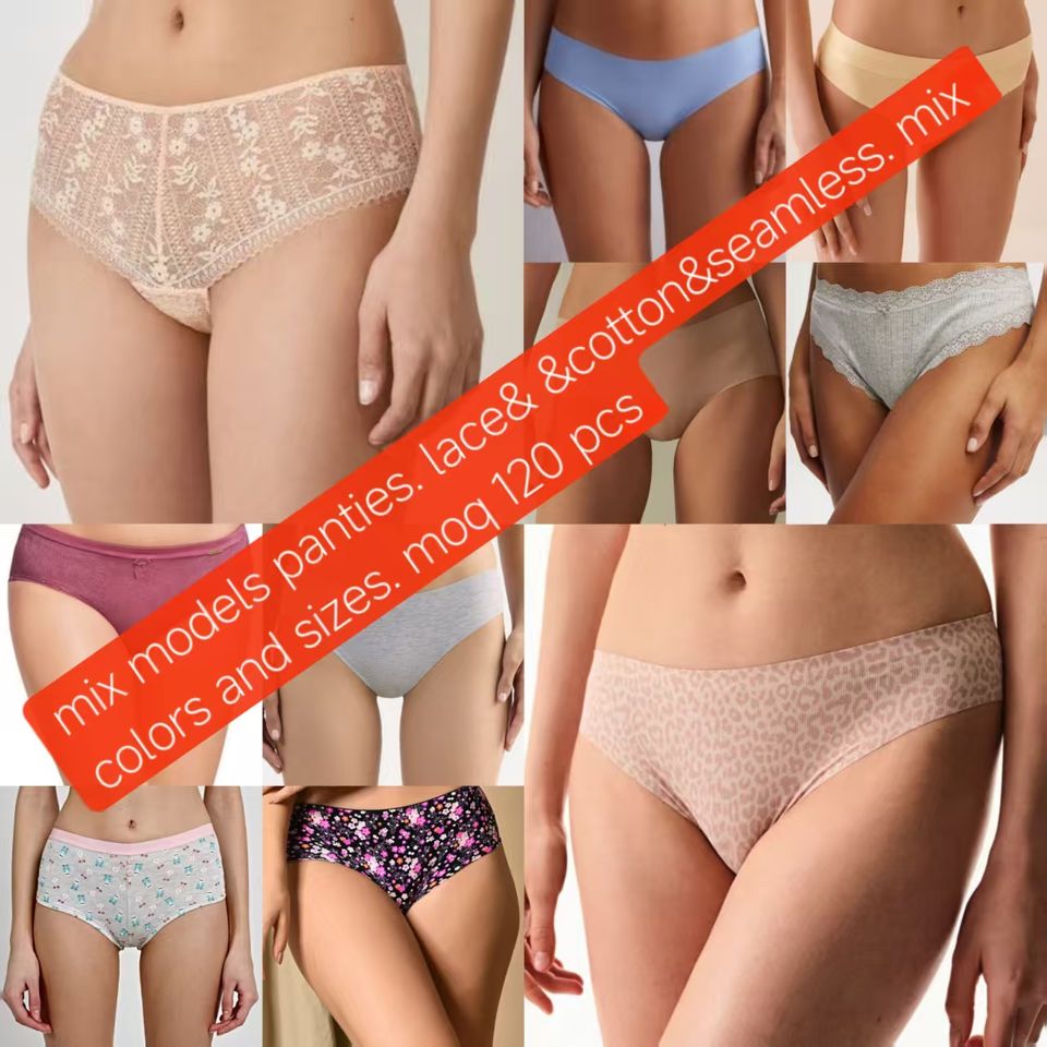 Mutandine Modelli Assortiti. Pizzo e cotone e tessuto senza cuciture. Colori e taglie assortiti. MOQ 120 pezzi. Fornitura a lungo termine e aggiornamento continuo.