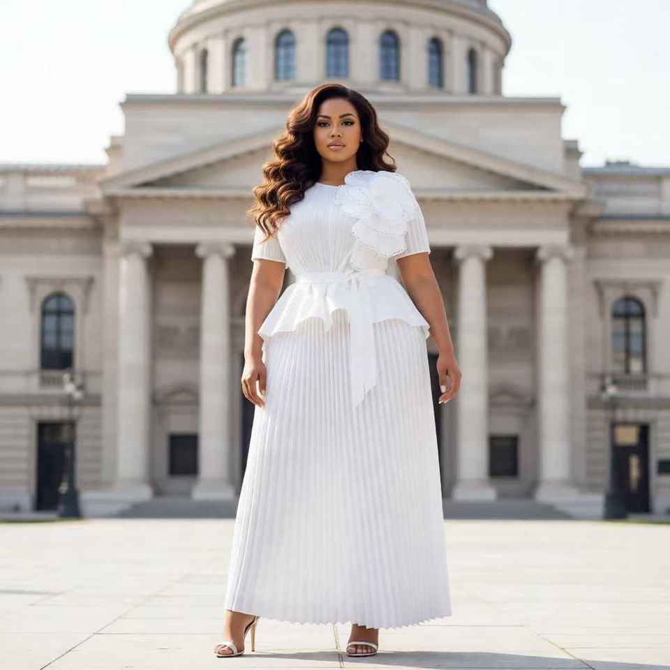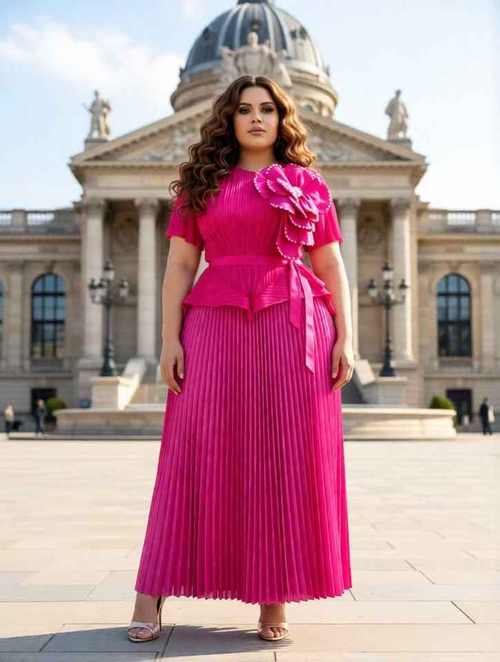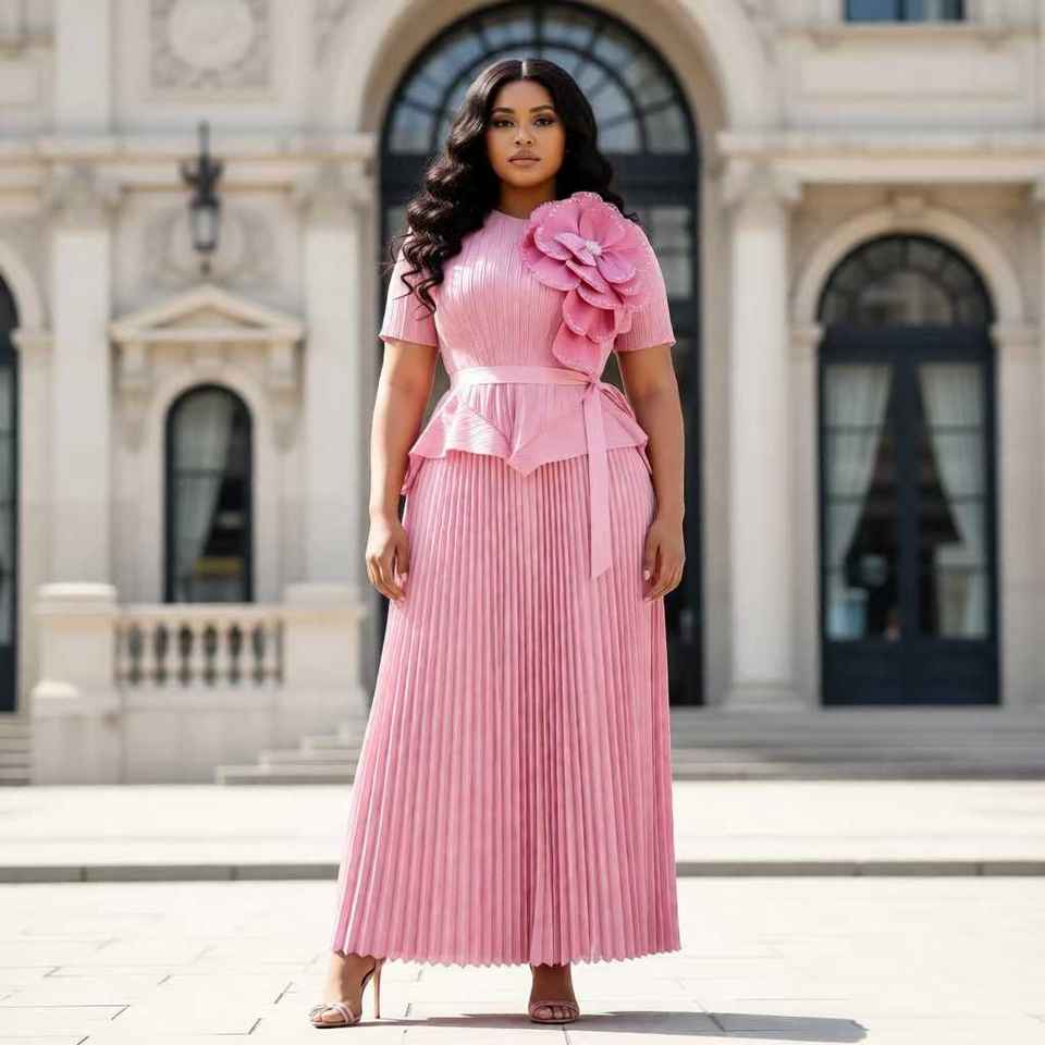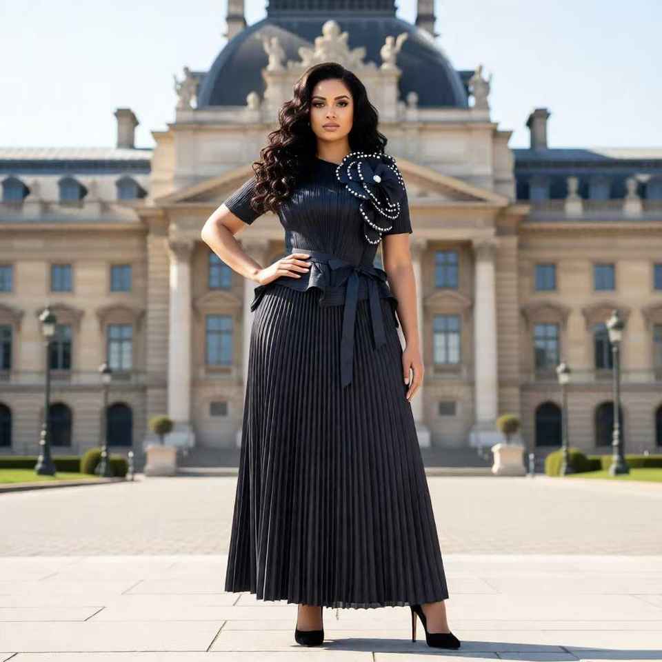 Completo Miyak con Top Irregolare Plissettato e Motivo Floreale Tridimensionale con Diamanti e Gonna Lunga Plissettata