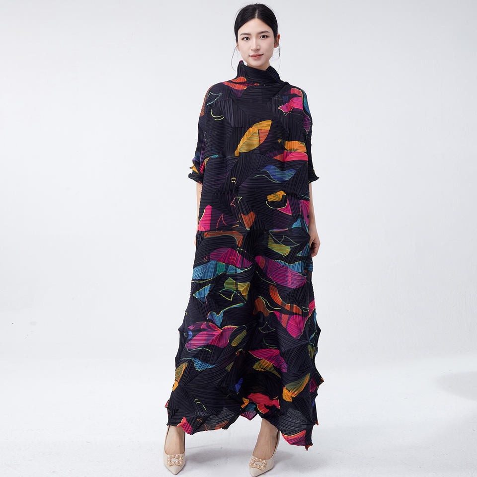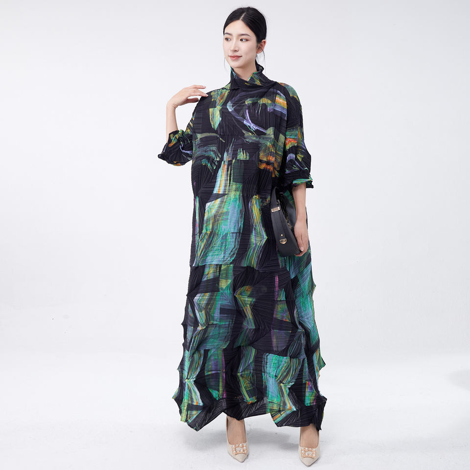 Miyake Factory Outlet Women's Casual Style Maxi Pleated Dress Loose Plus Size Fashion Personality Belt Ruched Patterns Fits