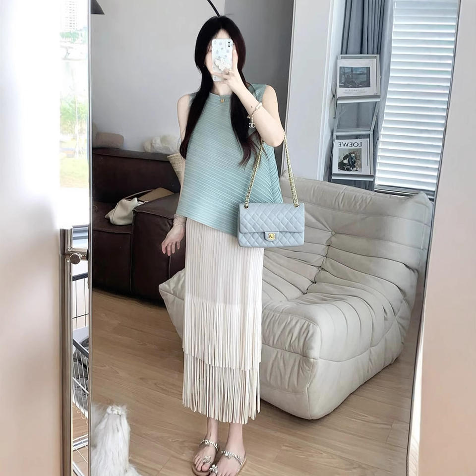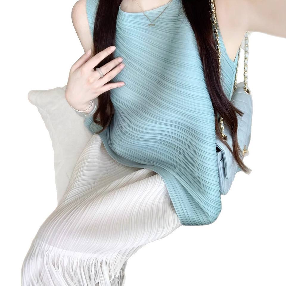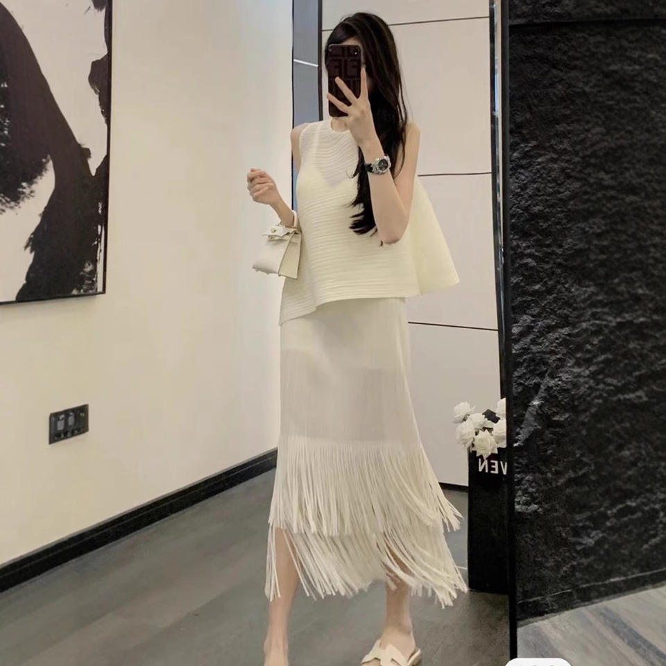 Completo da donna Miyake estivo tinta unita con fiocco e pieghe, composto da gilet e gonna overskirt con nappe, modello alla moda, venduto 100.000 pezzi