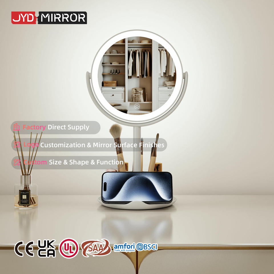 Supporto del telefono cellulare di 360 gradi girevole cosmetico illuminato luci Led rotondo specchio per il trucco di vanità con lo stoccaggio