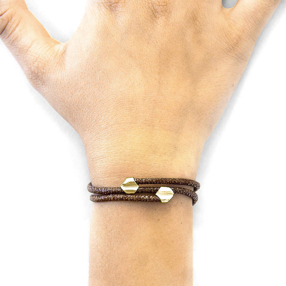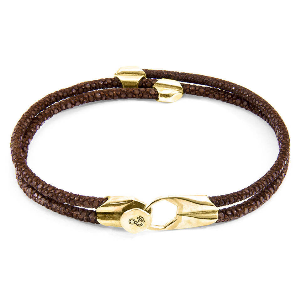 Bracciale Unisex ANCHOR CREW in Oro Giallo 9ct con Pelle di Razza e Dettagli in Moka, Regalo Perfetto