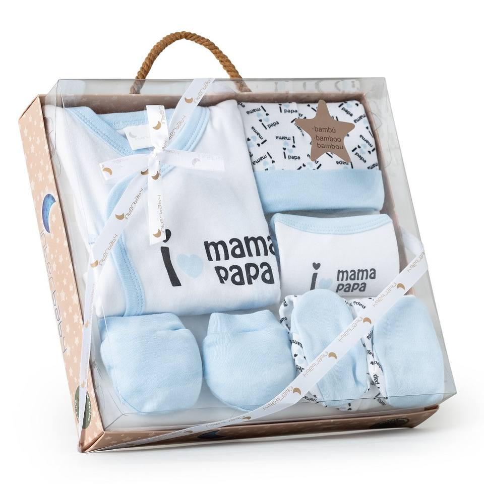 Mod. Set di Abbigliamento per Neonati Mama-Papa 5 Pezzi (Maglietta, Pantaloni, Guanti, Bavaglino, Calzini) - 100% Cotone - Blu per 0-6 Mesi
