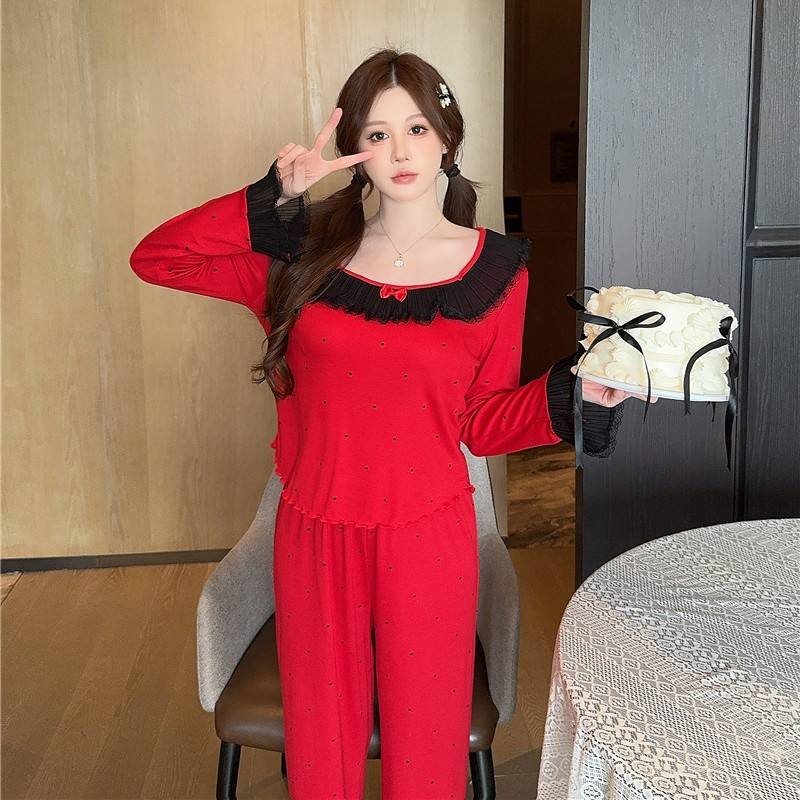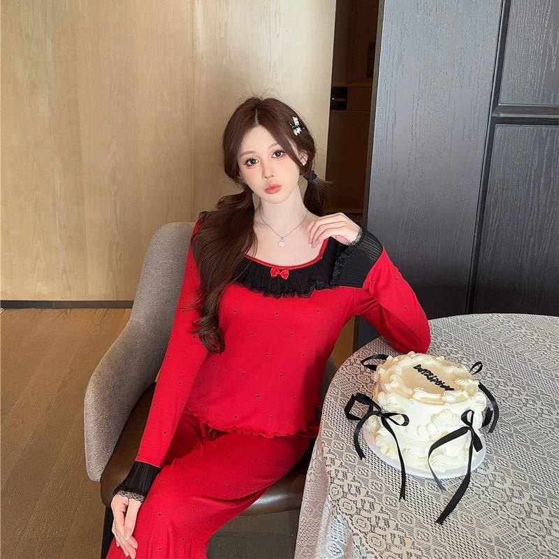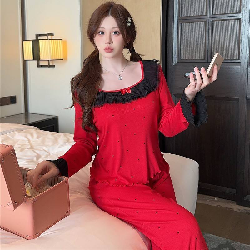 Abito modale a righe incassate con stampa a pois in pizzo comodo pantaloni a maniche lunghe più abbigliamento per la casa in cotone sul petto