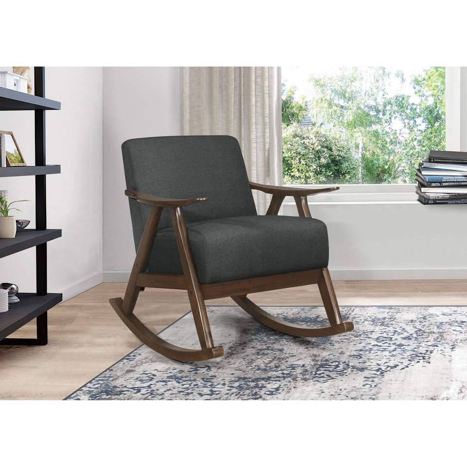 Moderna Sedia a Dondolo in Tessuto Grigio Scuro con Finitura in Noce, Seduta e Schienale Imbottiti in Legno per Soggiorno