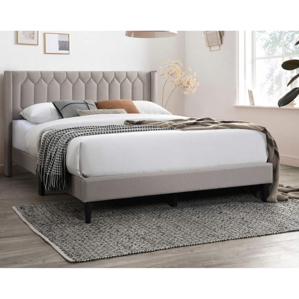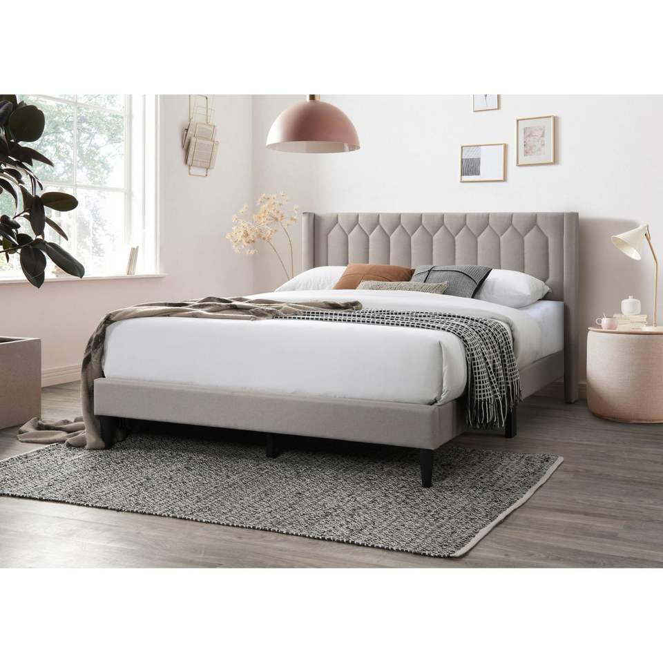 Moderna Struttura Letto Queen Size con Testiera Imbottita in Tessuto Marrone Chiaro con Design a Diamante Unico, Stile Accattivante e Distintivo