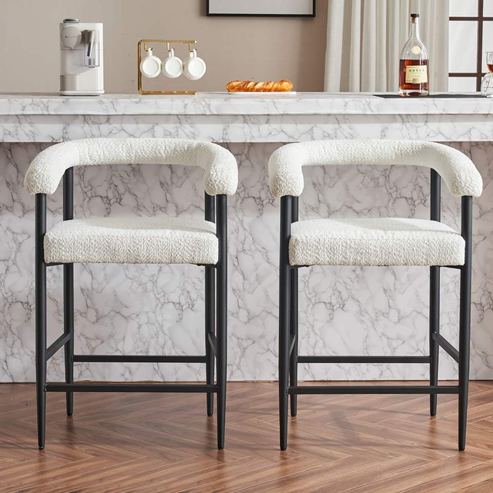 Modern 2-Pack White Bar Stools Boucle Fabric Counter Height Chairs Metal Frame Armrests for Home Dining Room Kitchen Island Cafe