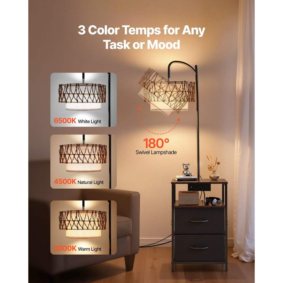 Comodino Moderno a 2 Livelli e 2 Cassetti con Lampada da Terra a LED a 3 Temperature di Colore e Tavolino Integrato