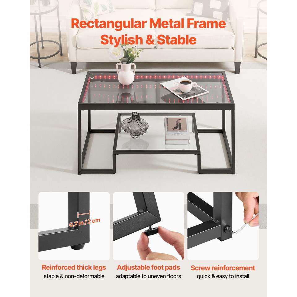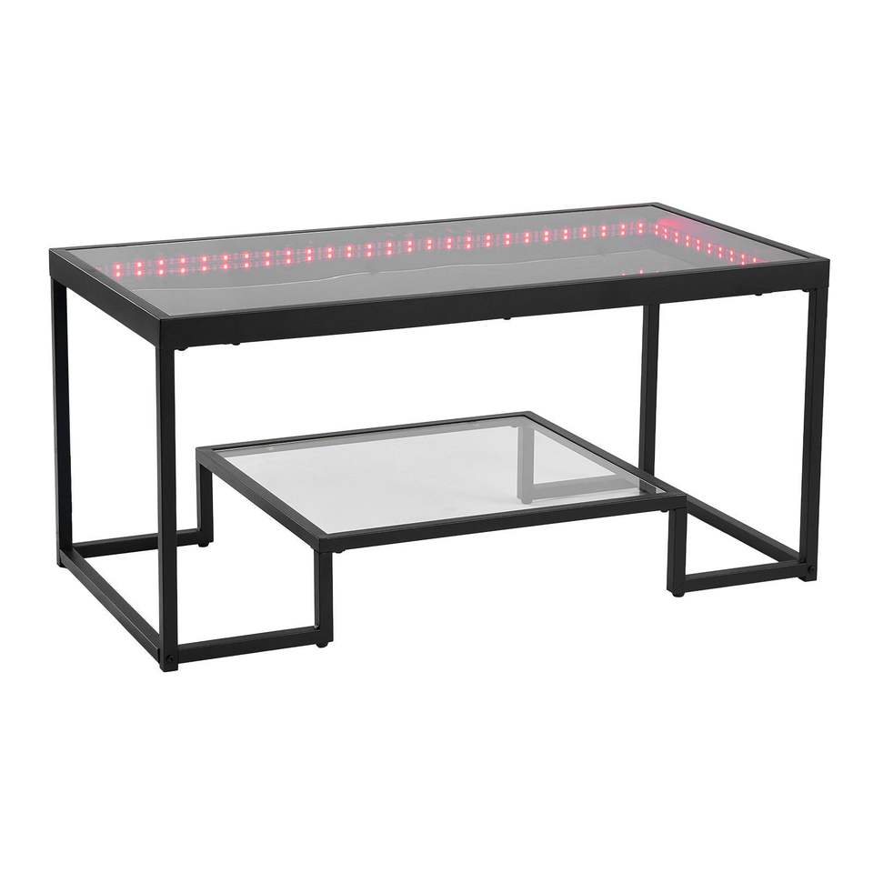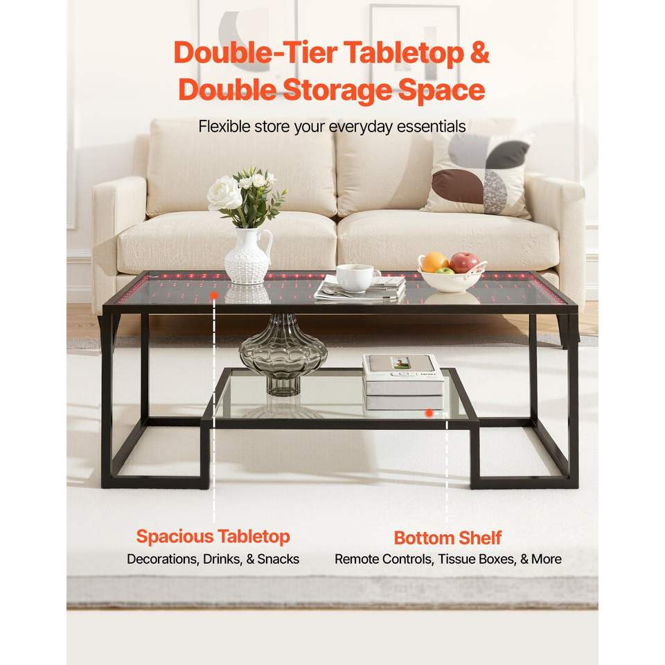 Tavolino da Caffè Moderno a 2 Livelli in Vetro Temperato con Illuminazione e Vano Portaoggetti, Scrivania Minimalista per Casa o Ufficio