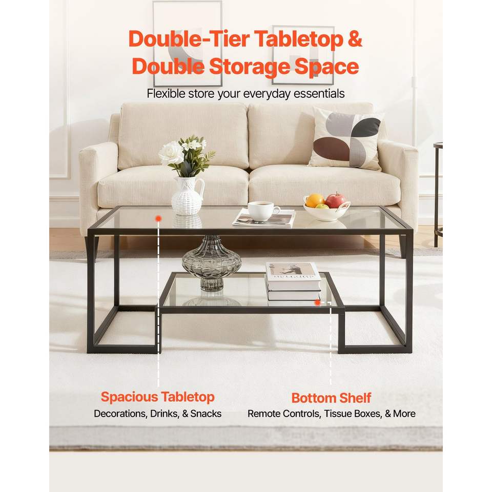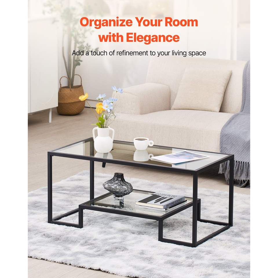 Tavolino da Caffè Moderno a 2 Ripiani in Vetro Temperato con Vano Portaoggetti Aperto, Scrivania Centrale Rettangolare in Metallo Robusto e Minimalista per Casa o Ufficio