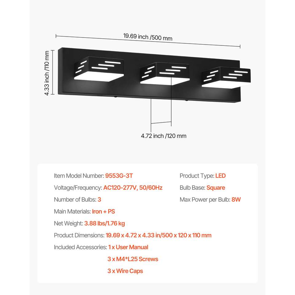 Lampada da Parete Moderna a 3 Luci LED per Bagno, 19,69 Pollici, Finitura Nera, Illuminazione da Parete con Impermeabilità IP44 per Bagni Moderni