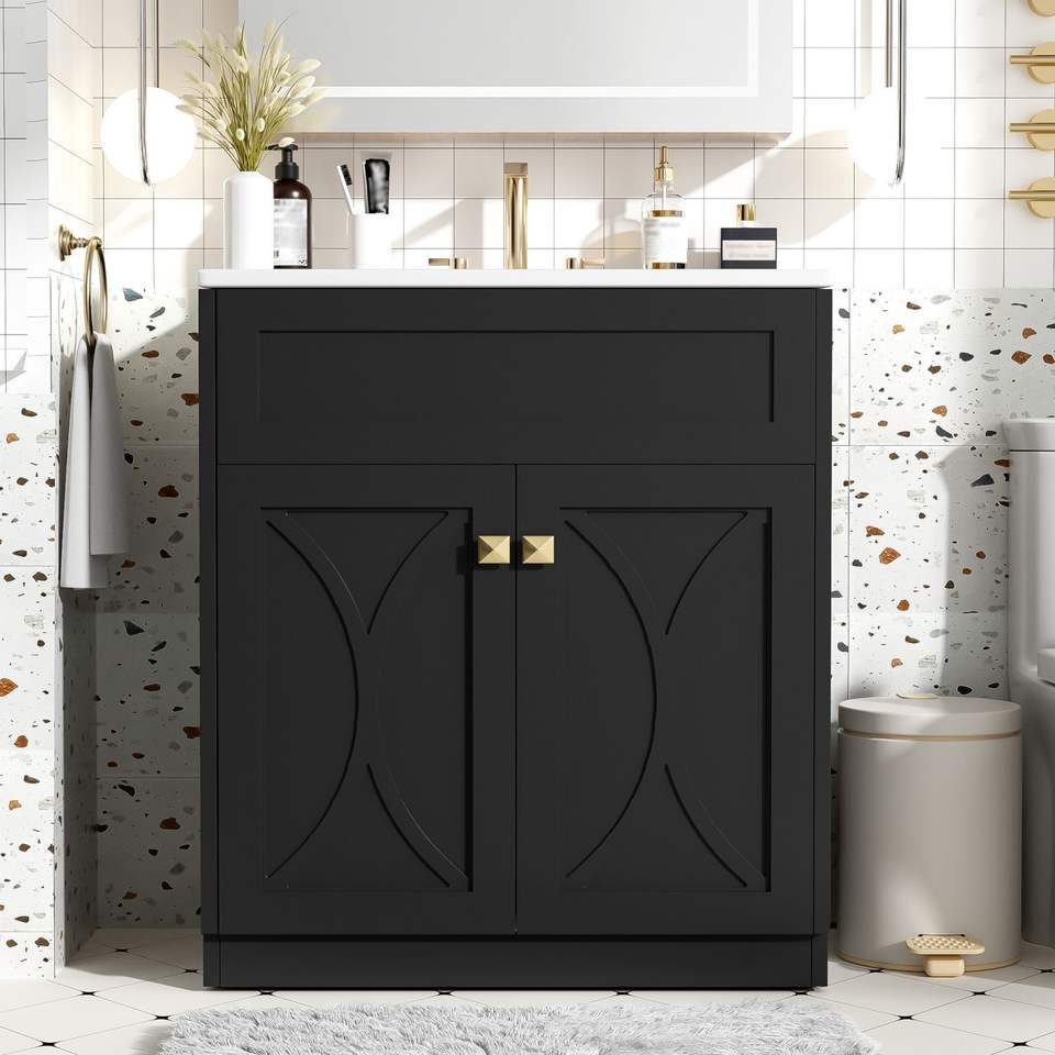 Moderno lavello da bagno da 30 ''con lavello in ceramica con manico in oro e porta portaoggetti autoportante