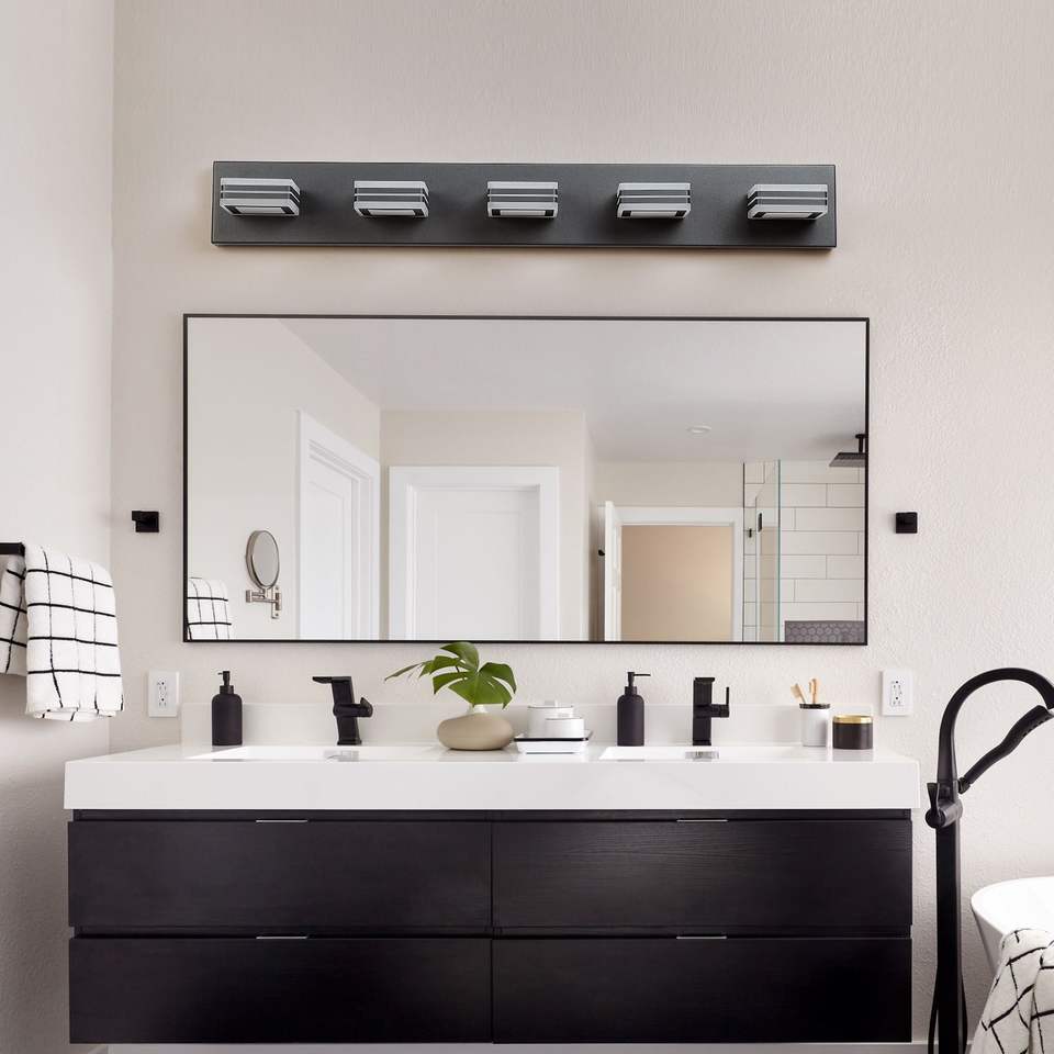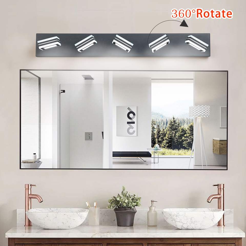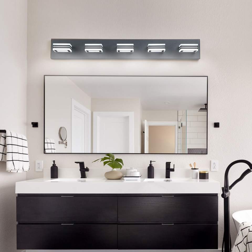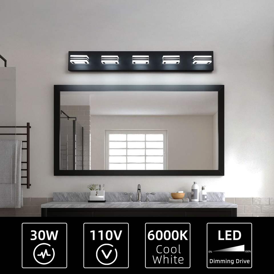 Moderna Lampada da Parete a 5 Luci LED Nera da 32 Pollici con Paralumi Quadrati in Acrilico e Illuminazione a Specchio per Bagno