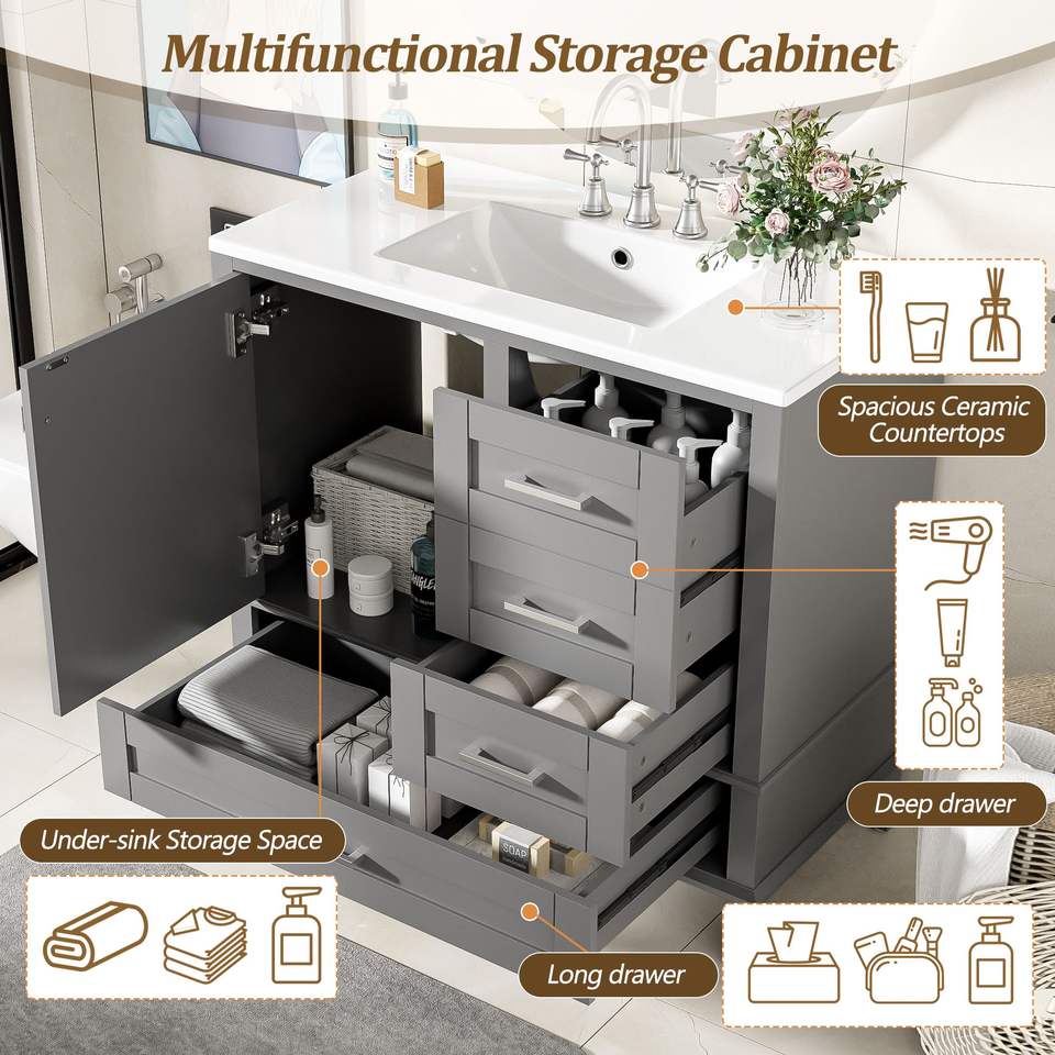 Mobile bagno moderno da 90 cm con telaio in pino massiccio, 1 anta soft-close e 3 cassetti
