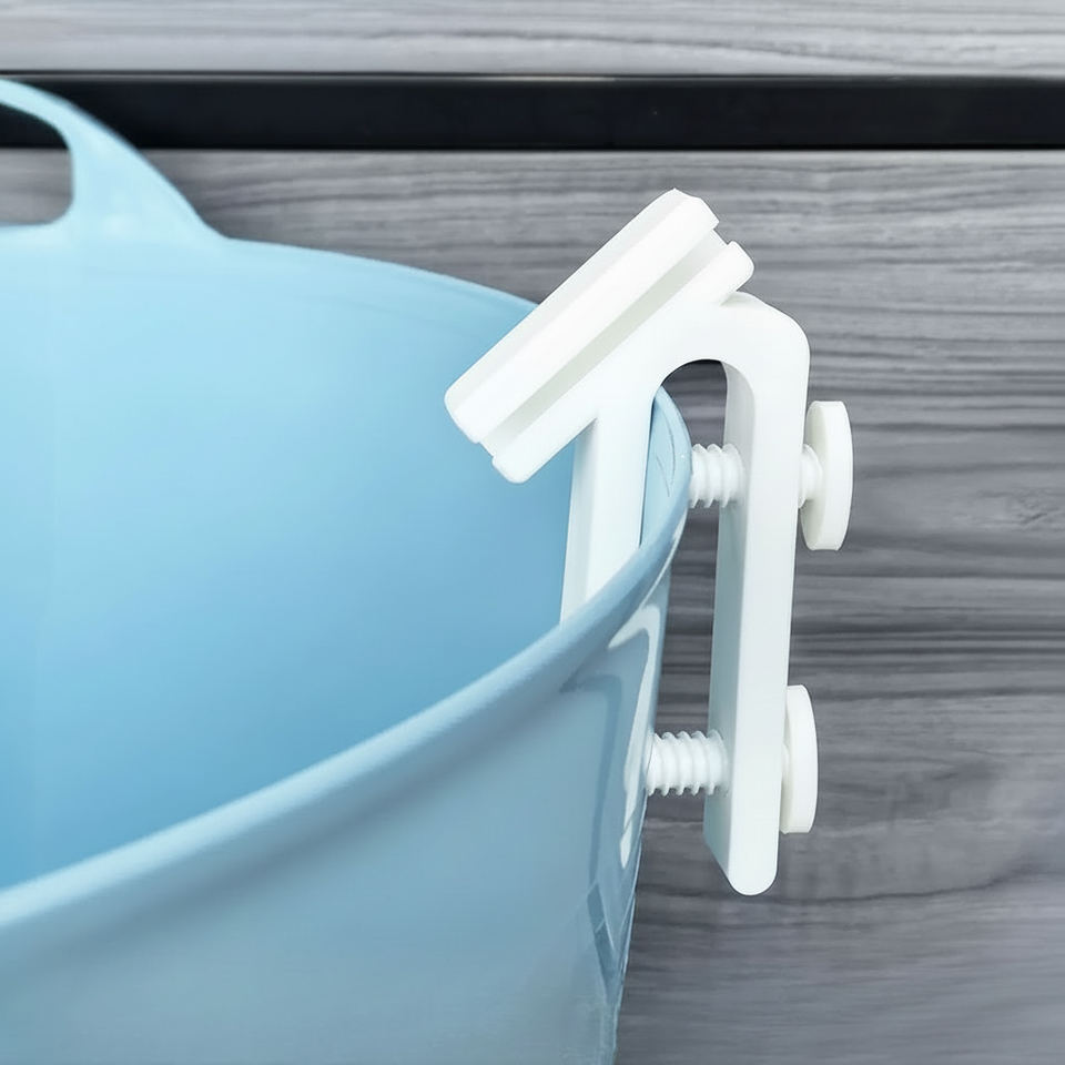 Il secchio stampato in 3D è fissato al bordo del secchio con un supporto per tubo.