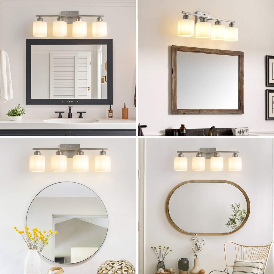 Lampada da Bagno Moderna a 4 Luci, Finitura Nichel Spazzolato con Paralume in Vetro Satinato Bianco Latte, Applique da Parete