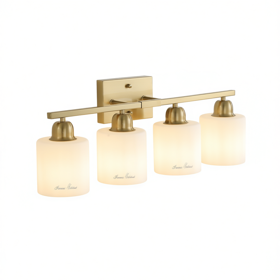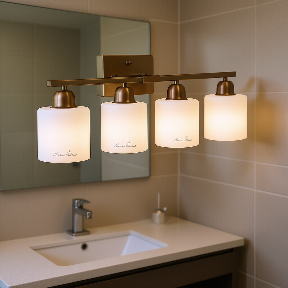 Lampada da Specchio Moderna a 4 Luci in Ferro Ramato con Paralumi in Vetro Satinato, Montaggio a Parete, Attacco E26, Luce Bianca Calda