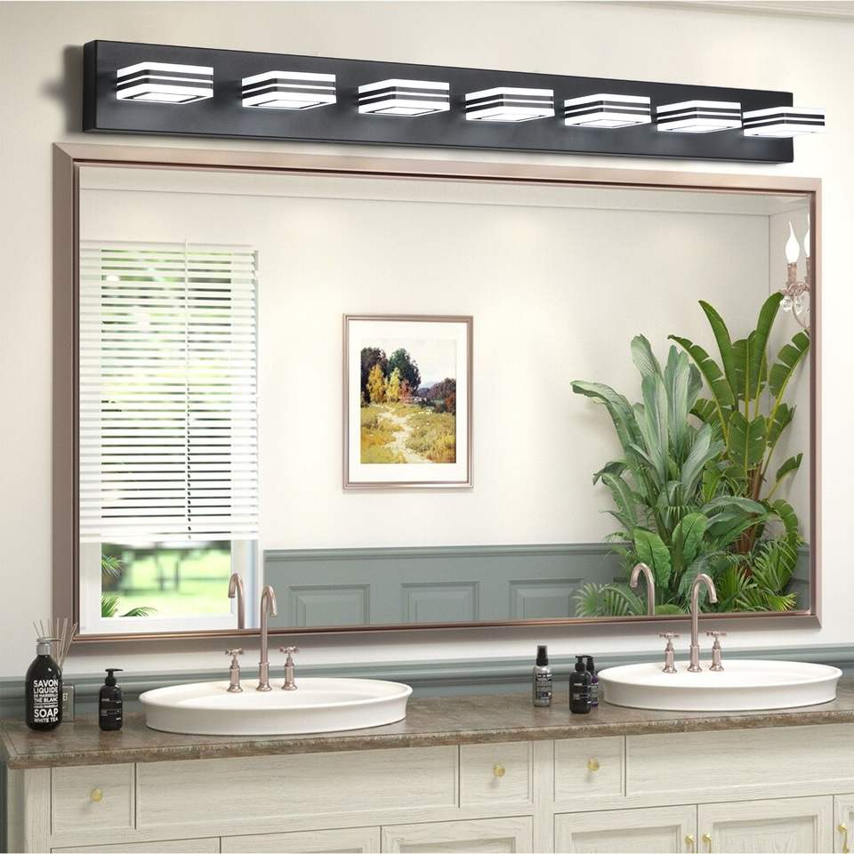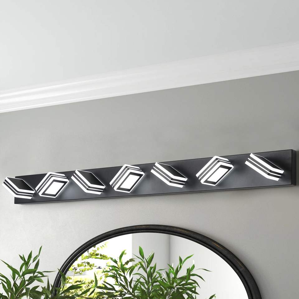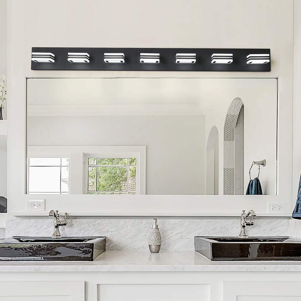 Moderna Lampada da Parete a 7 Luci LED Nera da 45 Pollici con Paralumi Quadrati in Acrilico per Illuminazione Specchio Bagno