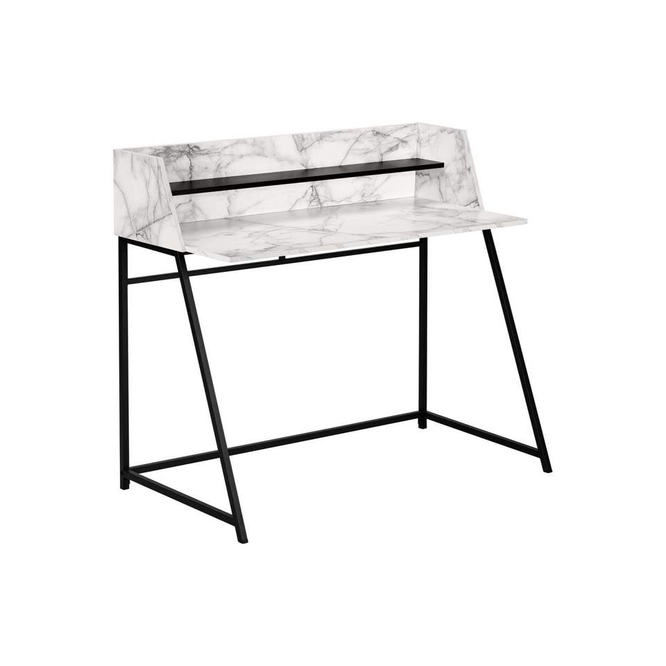Modern 48\"L Home Office Computer Desk with White Marble Look Laminate & Black Metal Contemporary Laptop Storage Shelves