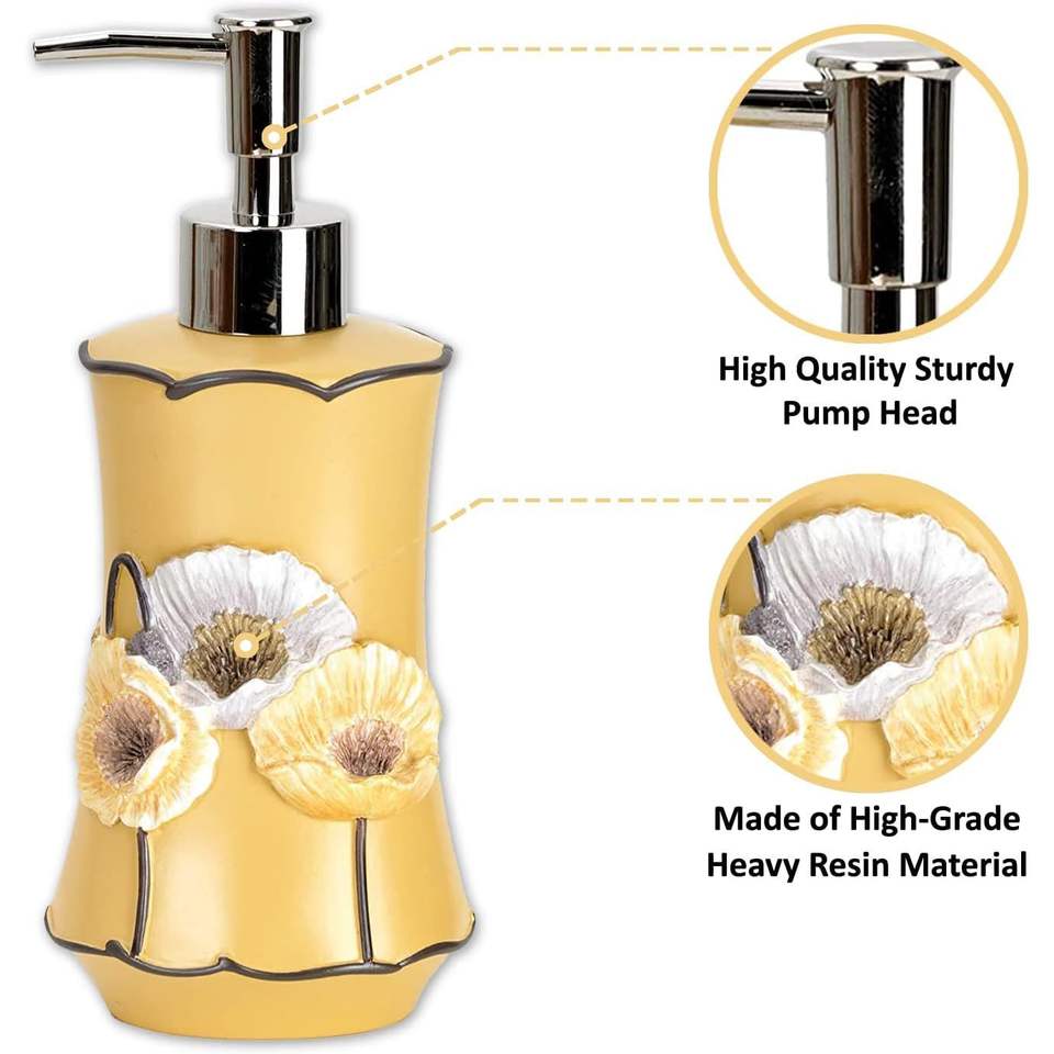 Set Moderno di 4 Accessori Bagno Poppy Fields Giallo con Dispenser Sapone Liquido, Bicchiere, Porta Spazzolino e Portasapone