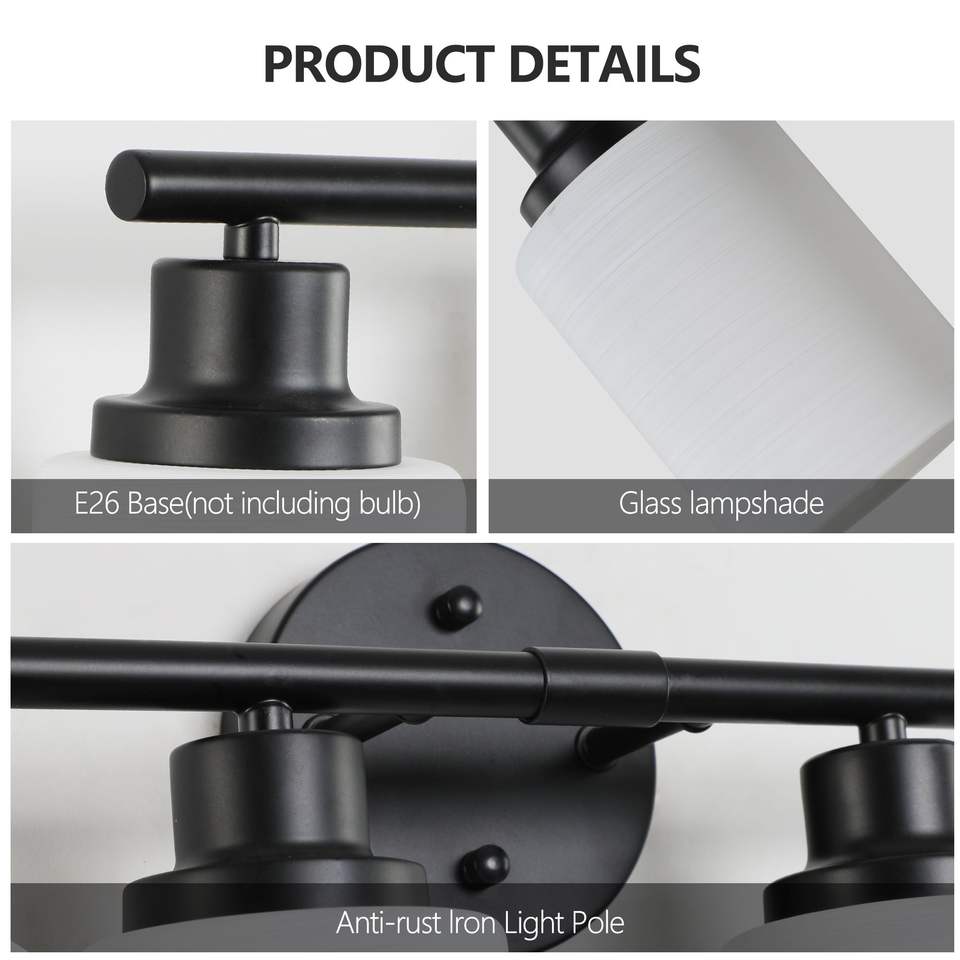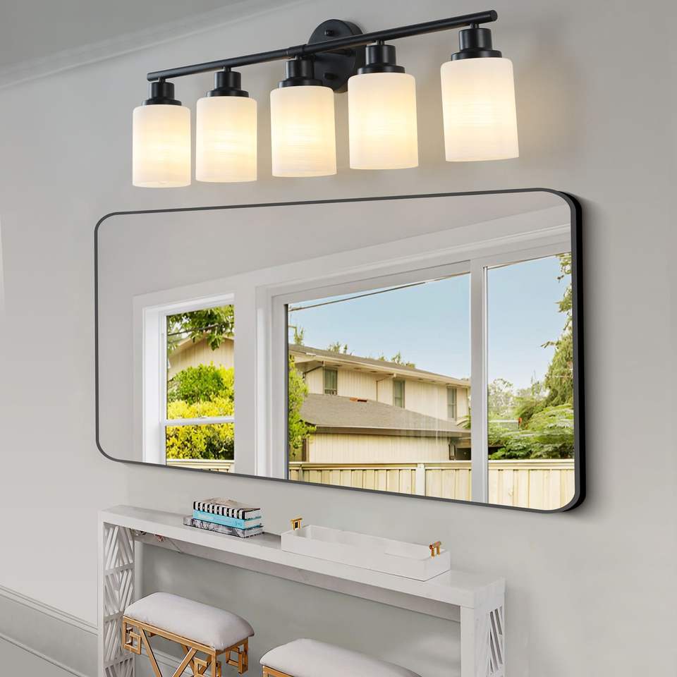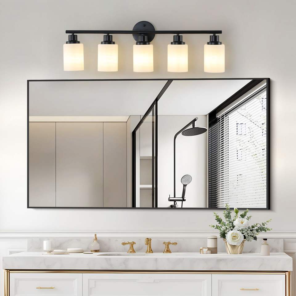 Specchio da Bagno Moderno a 5 Luci da 31 Pollici con Vetro Smerigliato Bianco e Cornice in Ferro Nero, Applique da Parete Contemporanea per Camera da Letto