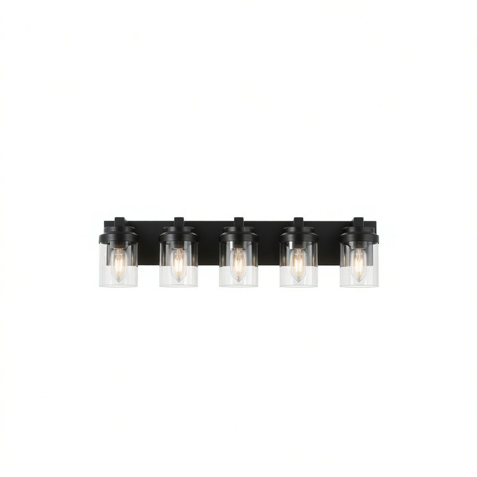 Lampada da Bagno Moderna a 5 Luci, Finitura Nera Opaca, Paralume in Vetro Trasparente, Montaggio a Superficie, Luce Bianca Calda 2700K