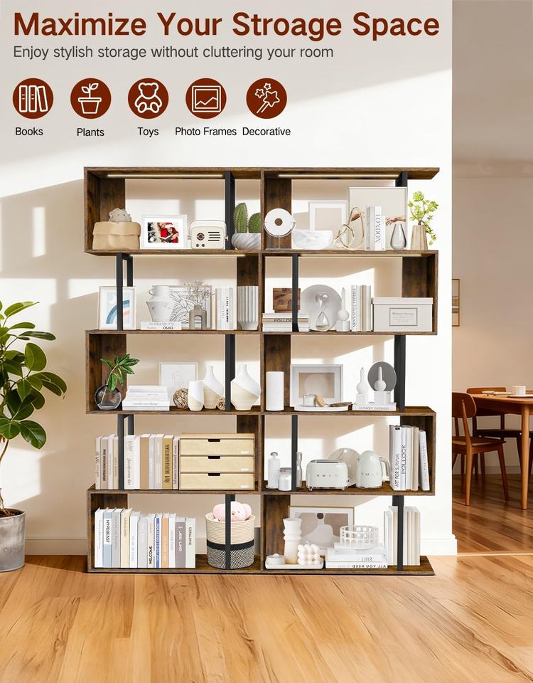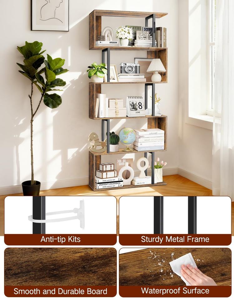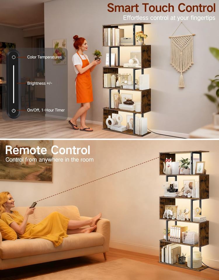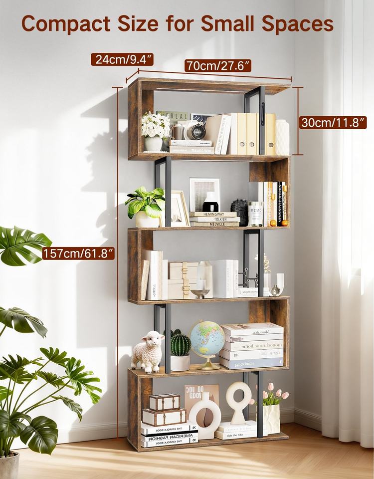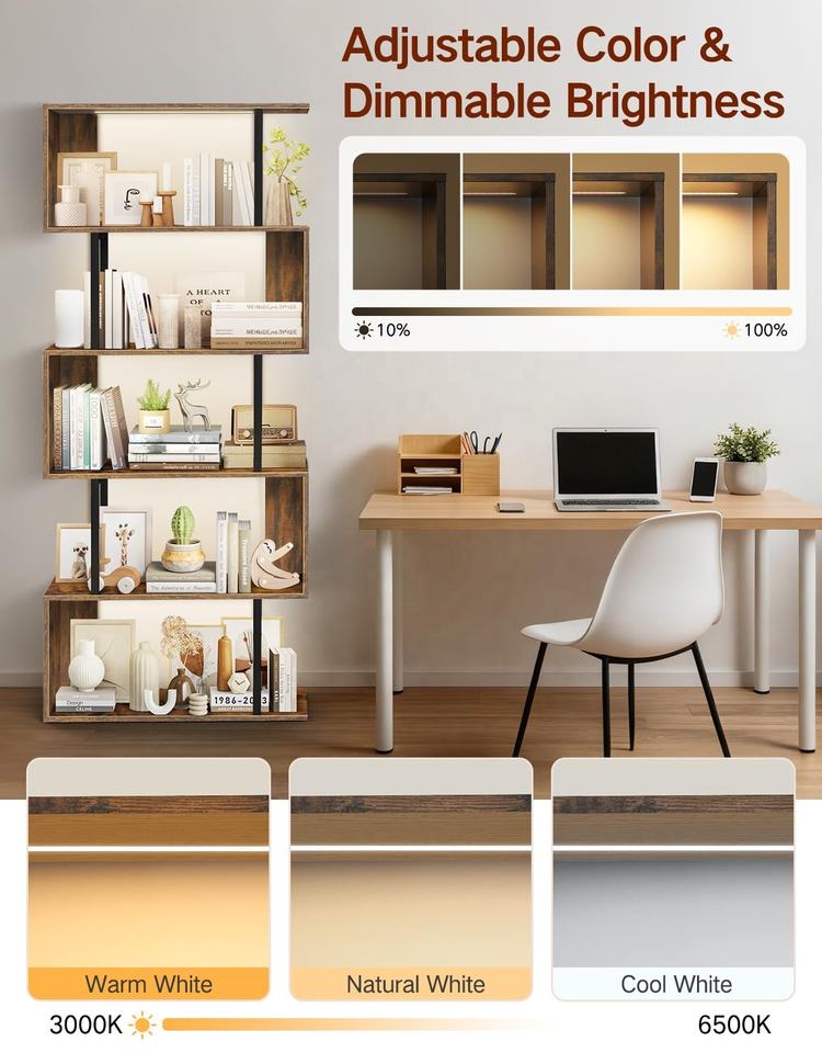 Libreria Moderna a 5 Ripiani a Forma di S con Luci LED, Scaffale Marrone Rustico per Ufficio Domestico, Espositore Decorativo Industriale