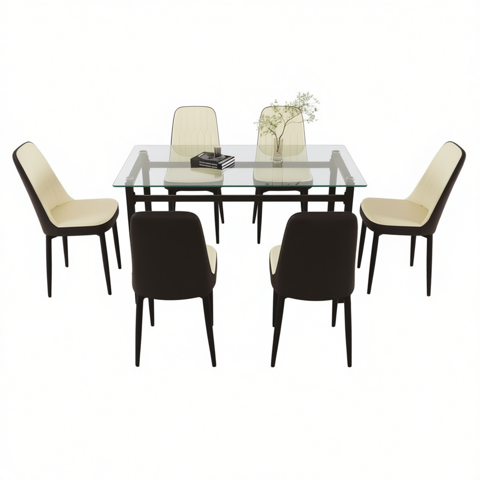 Set Tavolo da Pranzo Rettangolare Moderno per 6 Persone, 51 Pollici, Vetro Temperato, Gambe in Metallo Nero, Sedie Imbottite in PU, Modello D0100XUI2UY