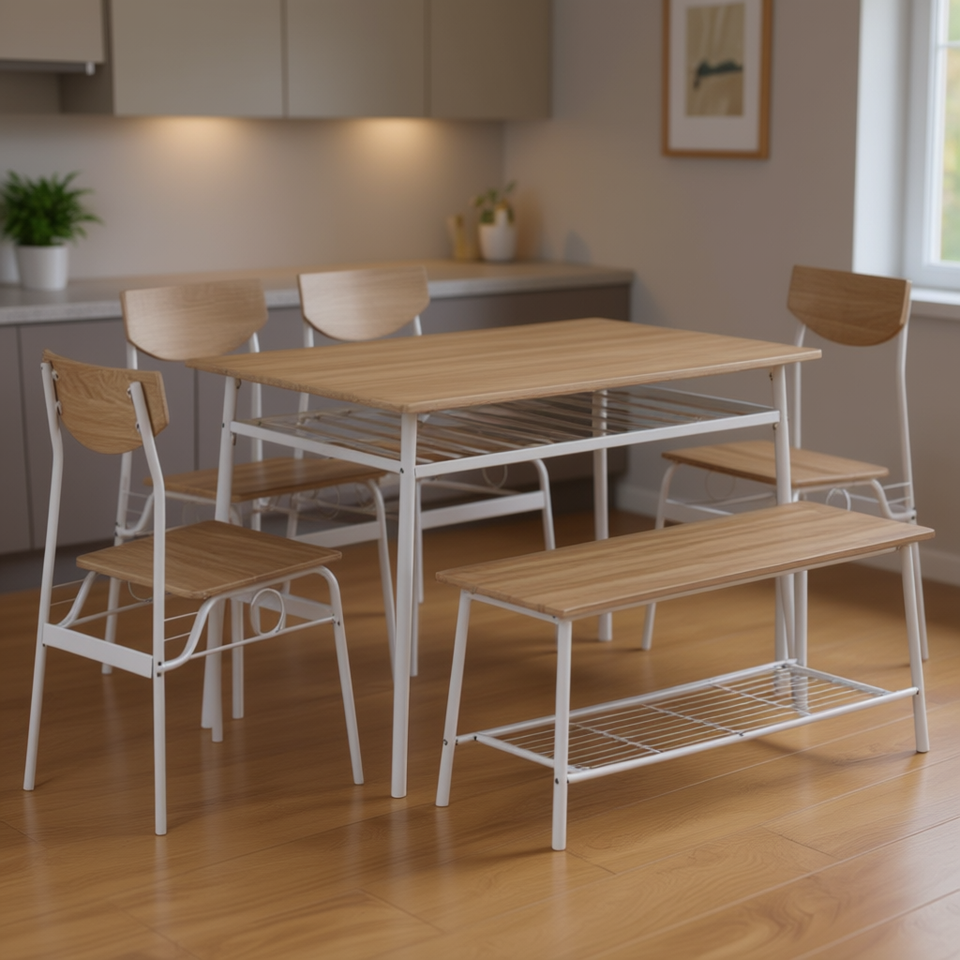 Set da pranzo moderno da 6 pezzi, colore rovere, struttura in acciaio con panca contenitore e 4 sedie per cucina, sala da pranzo e casa.