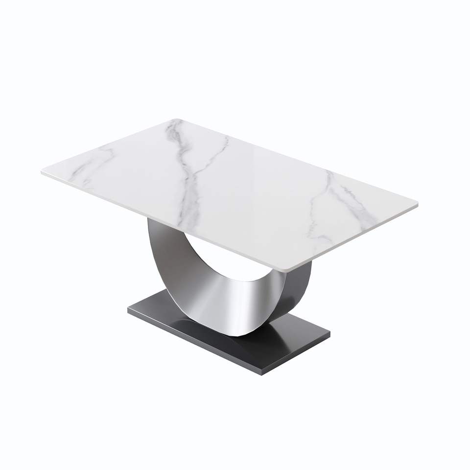 Moderno tavolo da pranzo in pietra artificiale 63 \ "con piano bianco a forma di mezzaluna e gambe in metallo nero può ospitare 6-8 persone