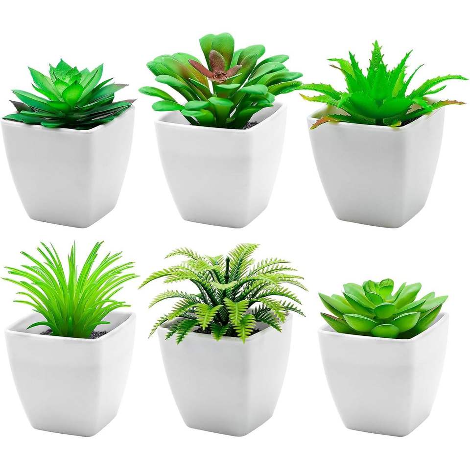 Set Moderno di 6 Piccole Piante Grasse Finte in Plastica per Decorazione Interna; 6 Pezzi di Piante Artificiali Ornamentali in Vasi Verdi