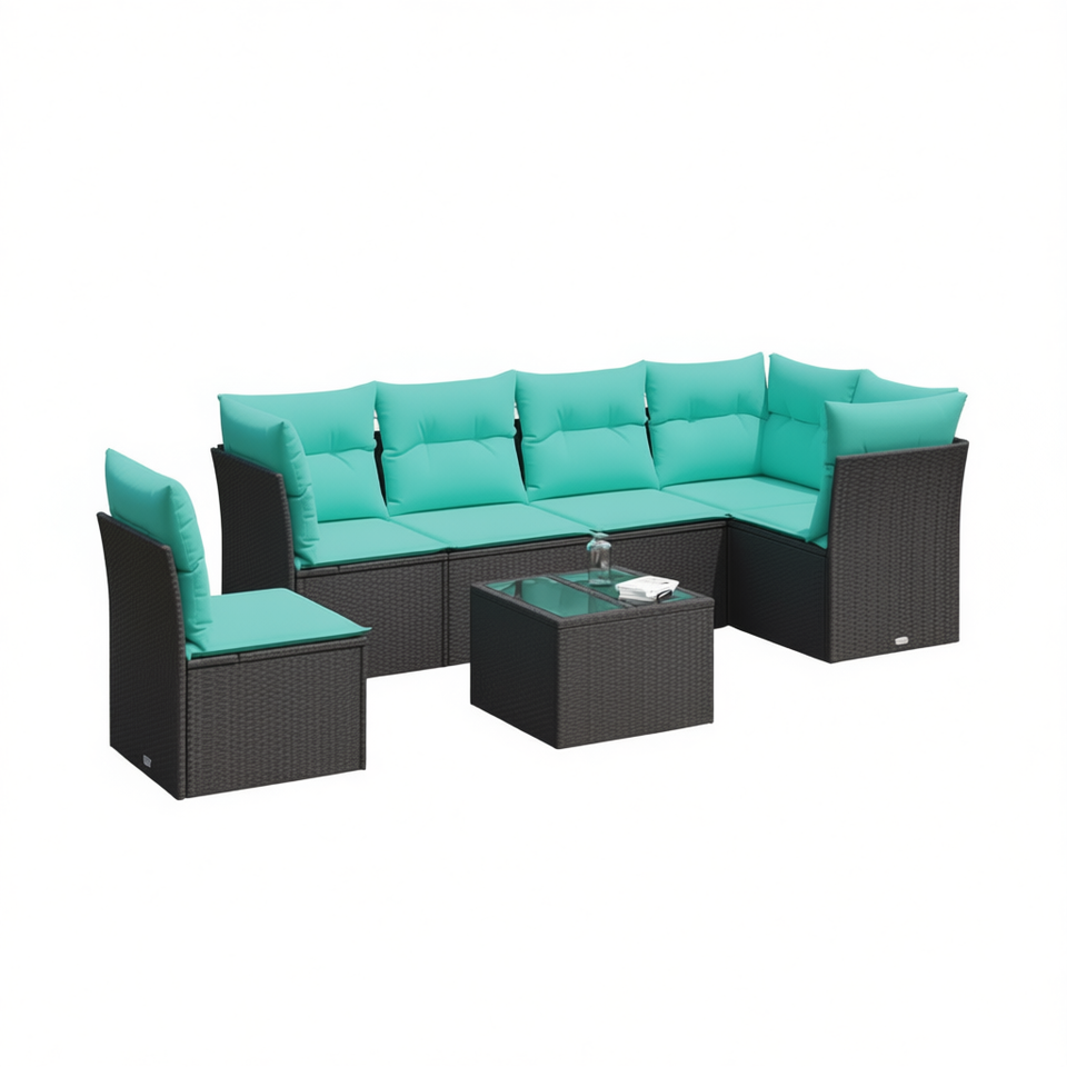 Set di divani da giardino moderni in polyrattan nero da 7 pezzi con cuscini, mobili da esterno, posti a sedere in stile contemporaneo per 7 persone
