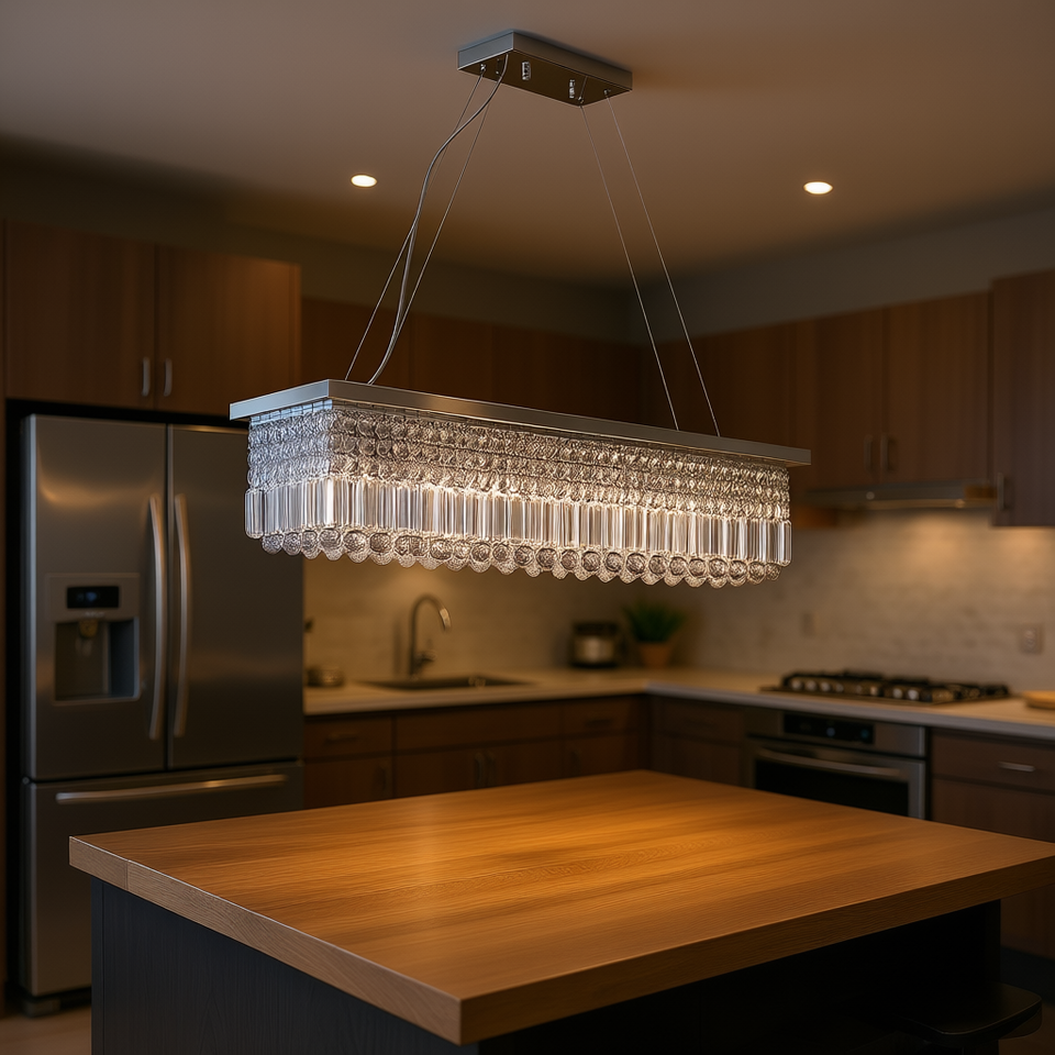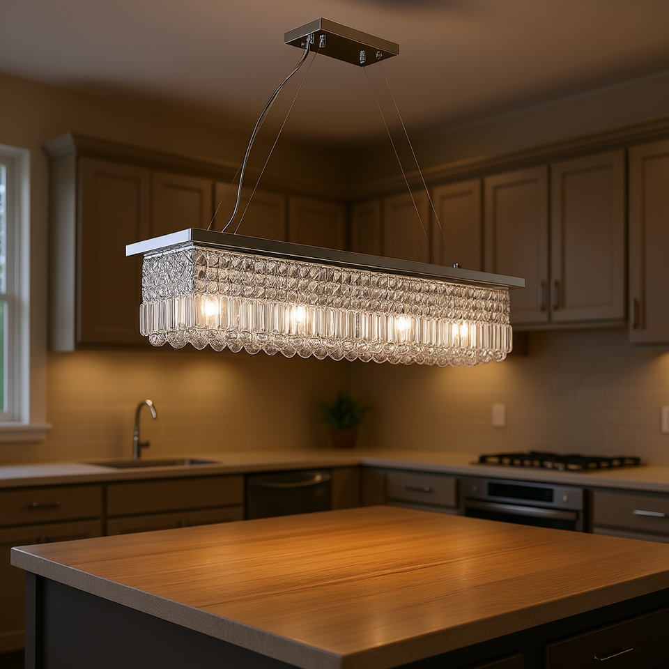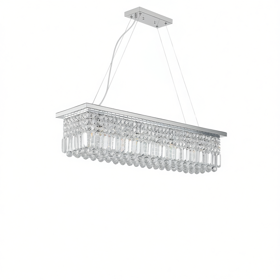 Lampadario moderno rettangolare in cristallo e ferro cromato a 8 luci a LED per isola cucina
