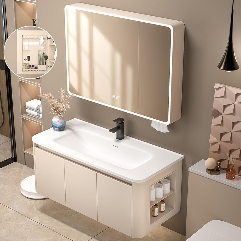 Mobile da Bagno Moderno Curvo di Piccole Dimensioni con Struttura a Nido d'Ape in Alluminio, Specchio a LED e Contenitore Laterale Creativo per Balcone