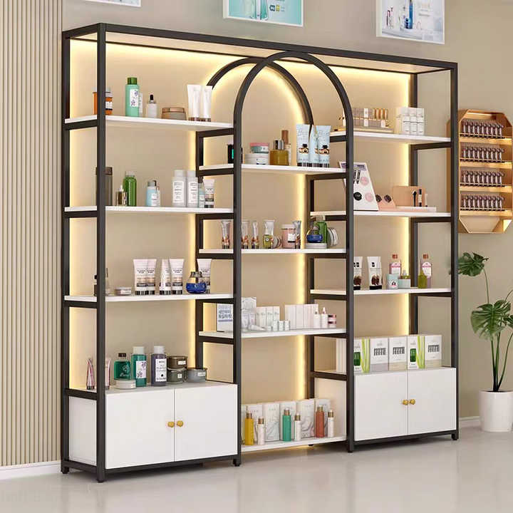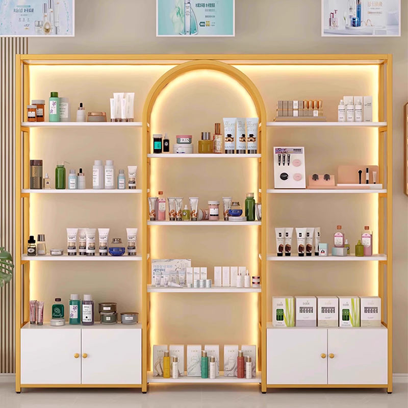 Espositore Cosmetico Moderno in Metallo con Design ad Arco e Illuminazione LED, con Armadietto per Negozi di Bellezza