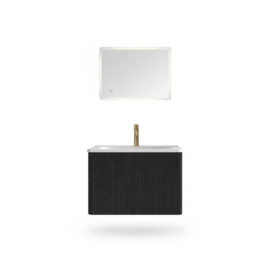 Mobile Bagno Moderno 24 Pollici in Rovere Nero con Lavabo in Ceramica Bianca a Strisce, Pezzo Unico, Preassemblato, Montaggio a Parete con Specchio LED