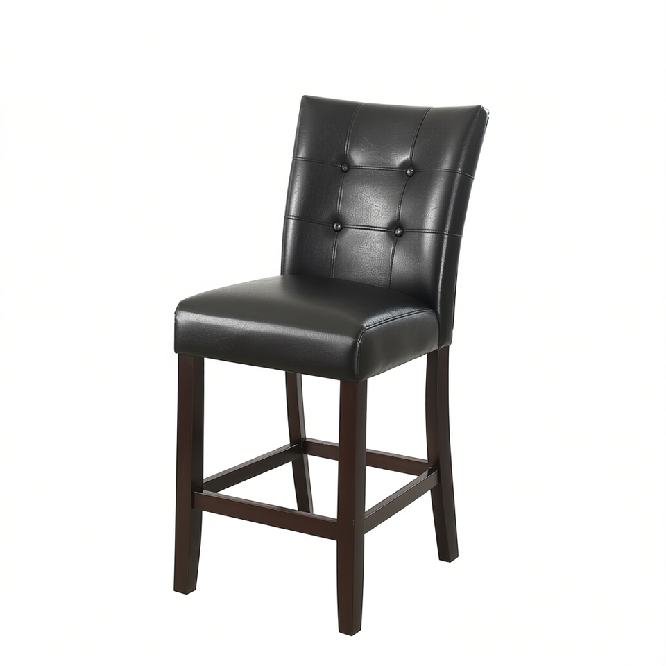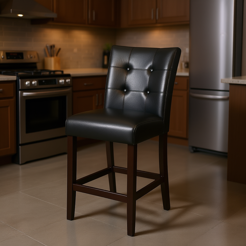Sedia da Bar Moderna in Ecopelle Nera Trapuntata con Struttura in Legno, Altezza da Pranzo