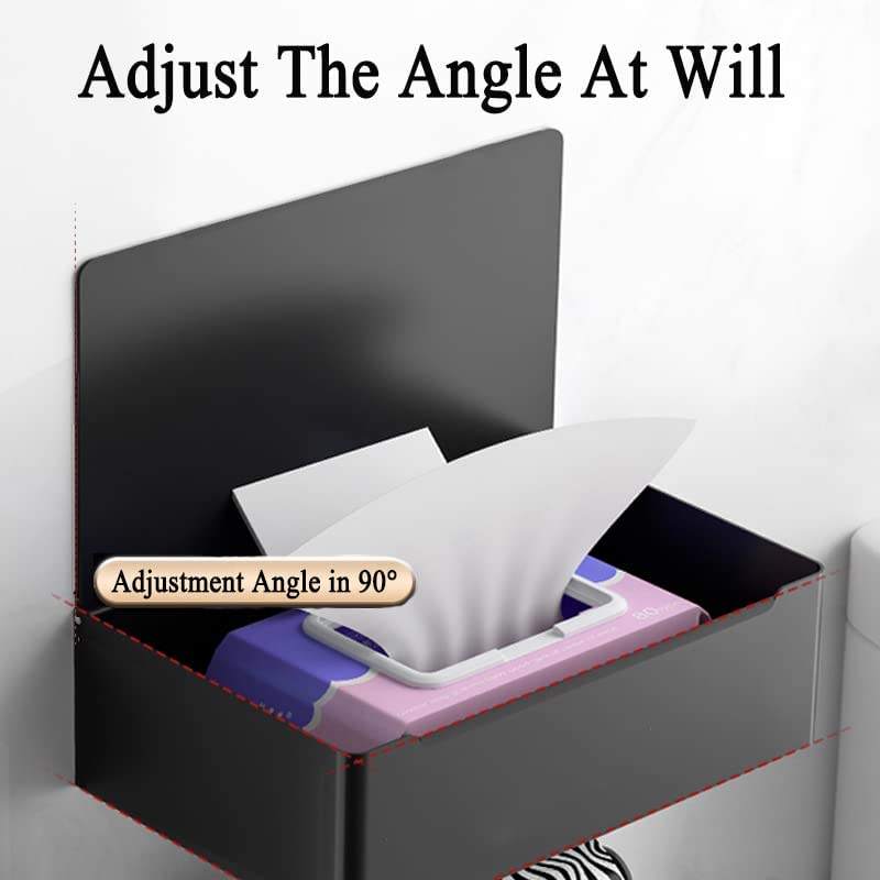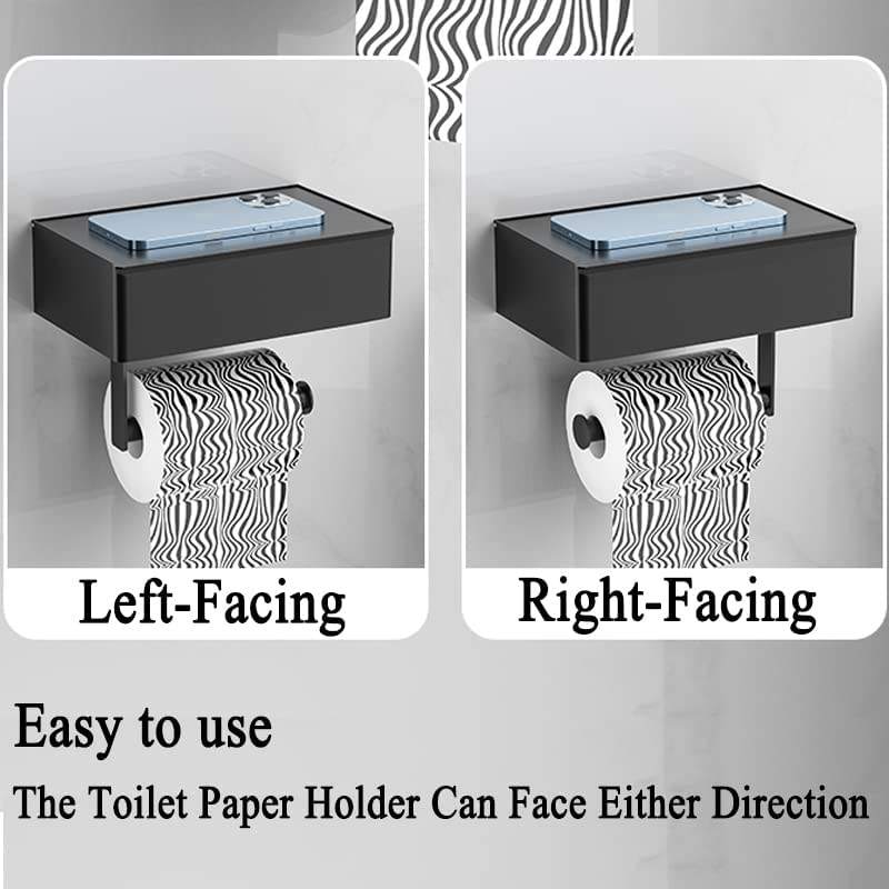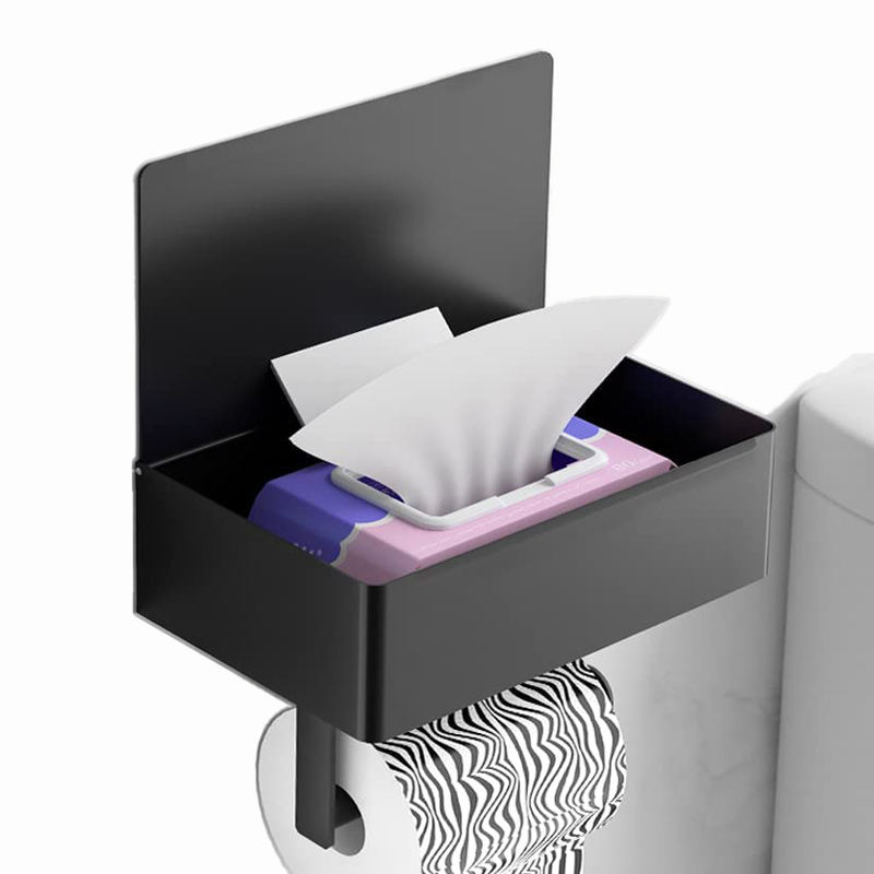 Modern Black Metal Toilet Roll Paper Stand Holder with Shelf Self-Adhesive Wall Mount for Bathroom Hotel & Living Room Storage