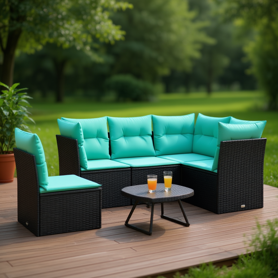 Set Divano da Esterno Moderno in Polyrattan Nero con Cuscini, 5 Posti, Design Contemporaneo